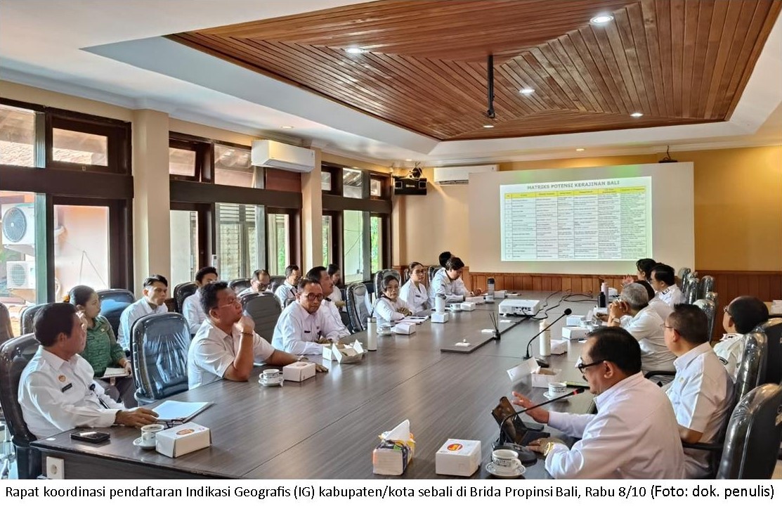 Rabu, 8 Oktober 2025, bertempat di ruang rapat di Ruang Rapat Swacitta Sabha Badan Riset dan Inovasi Daerah (Brida) Provinsi Bali, dilaksanakan rapat koordinasi membahas pendaftaran Indikasi Geografis (IG) kabupaten/kota sebali. Rapat dihadiri oleh Kepala Brida kabupaten kota di Bali, yang dipimpin oleh Kepala Brida Provinsi Bali, Dr. Ketut Wica, S.Sos., M.H., dengan narasumber dari Kanwil Kemenkum Provinsi Bali, Wayan Redana selaku Kepala Divisi Pelayanan Hukum.