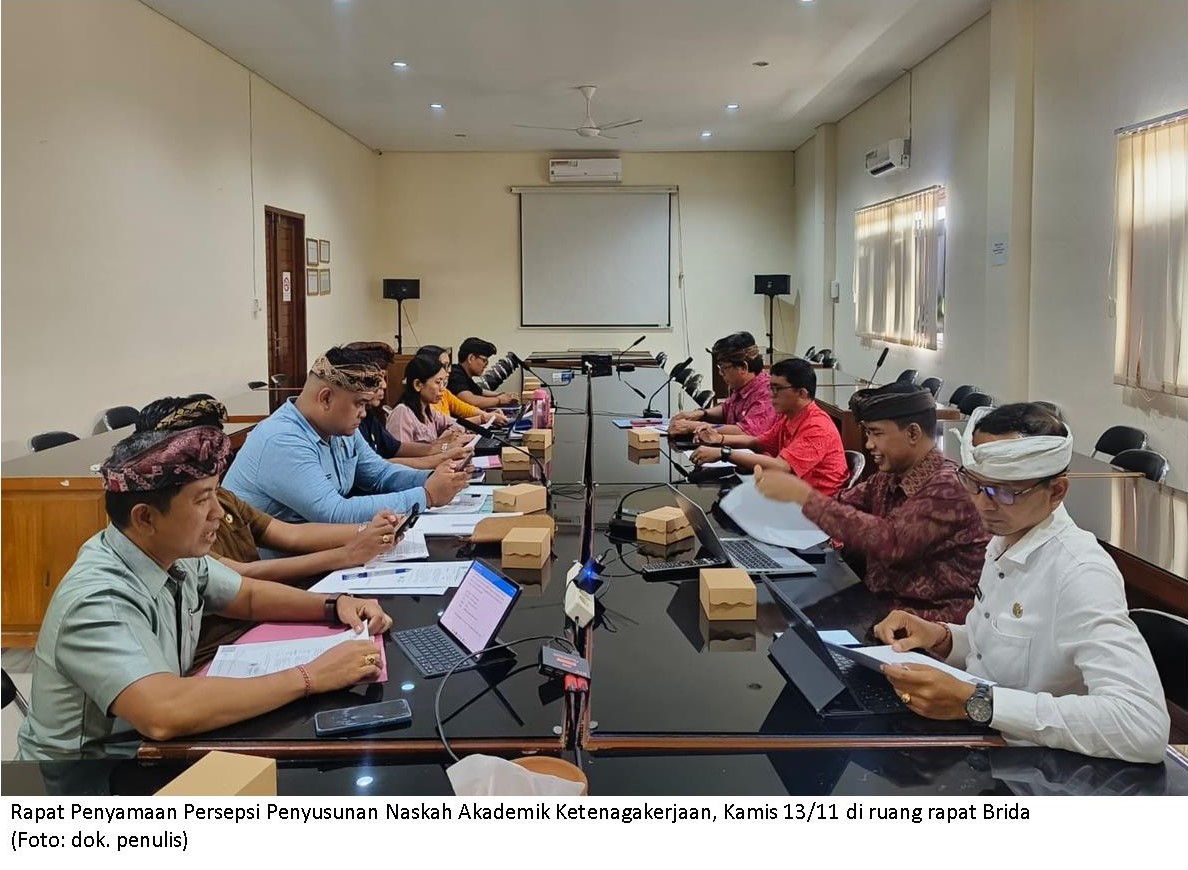 Badan Riset dan Inovasi Daerah (Brida) Kabupaten Buleleng melaksanakan Rapat Penyamaan Persepsi Penyusunan Naskah Akademik Ketenagakerjaan, Kamis (13/11) di ruang rapat setempat. Acara dipimpin Kepala Brida, Ketut Suwarmawan, S.S.T.P., M.M., dihadiri oleh Kepala Bagian Hukum Setda Buleleng, perwakilan dari Dinas Tenaga Kerja Kabupaten Buleleng, Rektor Universitas Panji Sakti Singaraja selaku Tim Pengendali Mutu (TPM), dan para pejabat lingkup Brida.