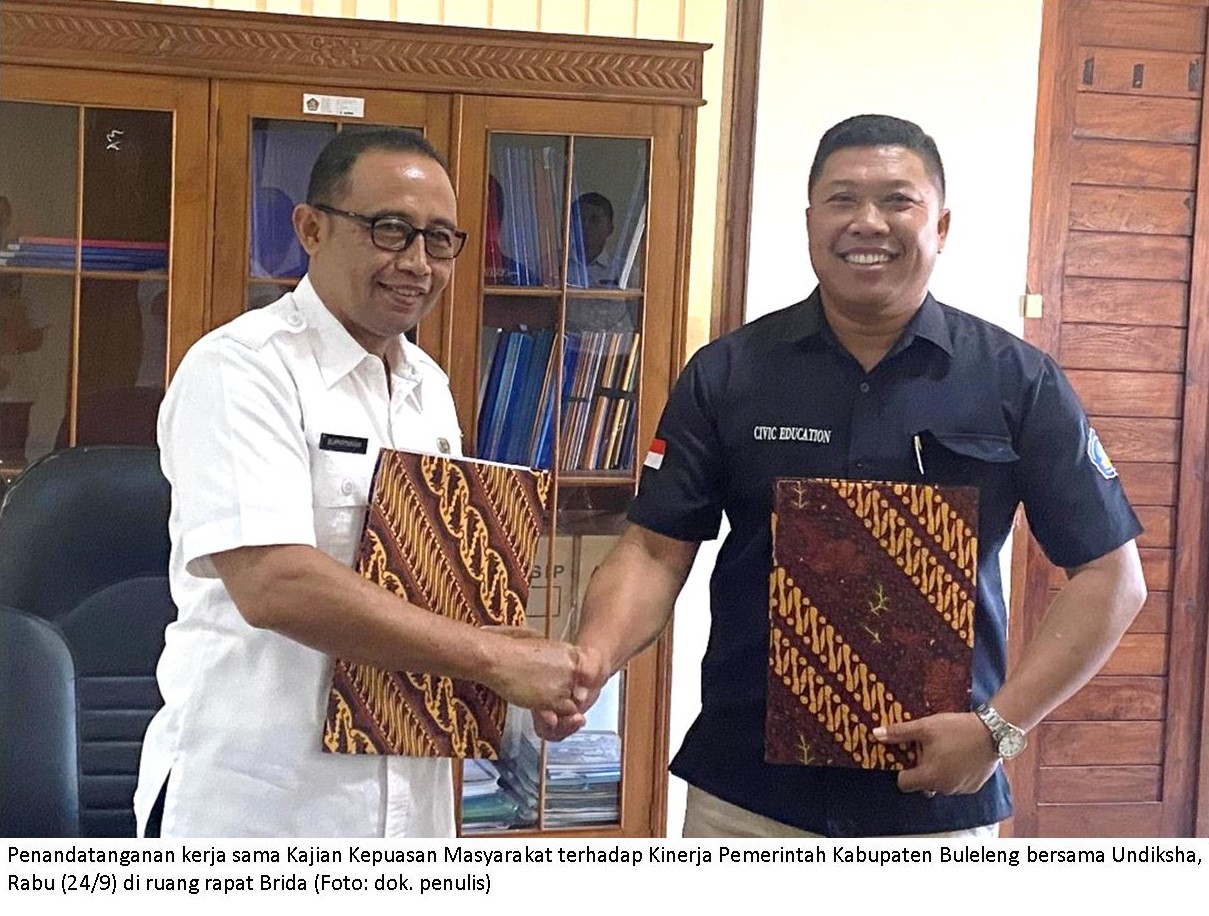 Badan Riset dan Inovasi Daerah (Brida) Kabupaten Buleleng resmi menandatangani kontrak kerja sama dengan Universitas Pendidikan Ganesha (Undiksha) Singaraja, dalam rangka penyusunan Kajian Kepuasan Masyarakat terhadap Kinerja Pemerintah Kabupaten Buleleng, Rabu (24/9) di ruang rapat Brida.