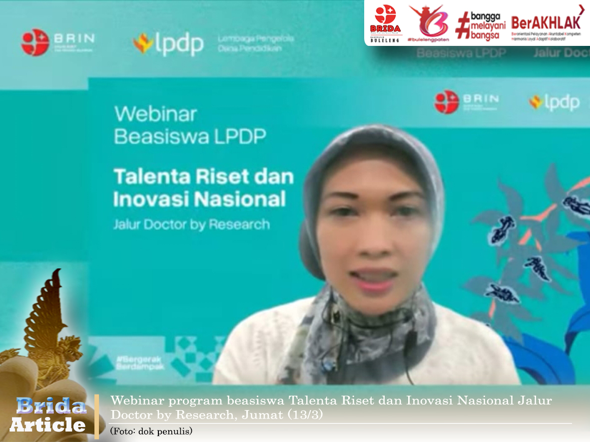 Webinar sosialisasi program Beasiswa Talenta Riset dan Inovasi Nasional Jalur Doctor by Research, diselenggarakan secara daring melalui kanal YouTube Badan Riset dan Inovasi Nasional dan Lembaga Pengelola Dana Pendidikan, Jumat (13/3).
