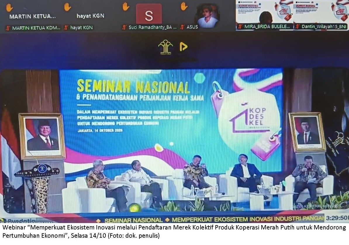 Webinar Nasional dengan tema “Memperkuat Ekosistem Inovasi melalui Pendaftaran Merek Kolektif Produk Koperasi Merah Putih untuk Mendorong Pertumbuhan Ekonomi”, diselenggarakan oleh Direktorat Jenderal Kekayaan Intelektual (DJKI) Kemenkum RI, Selasa (14/10). Webinar dalam rangka memajukan dan memperkuat Kekayaan Intelektual atas produk dan/atau jasa Koperasi Desa/Kelurahan Merah Putih melalui pelindungan Kekayaan Intelektual khususnya Pendaftaran Merek.