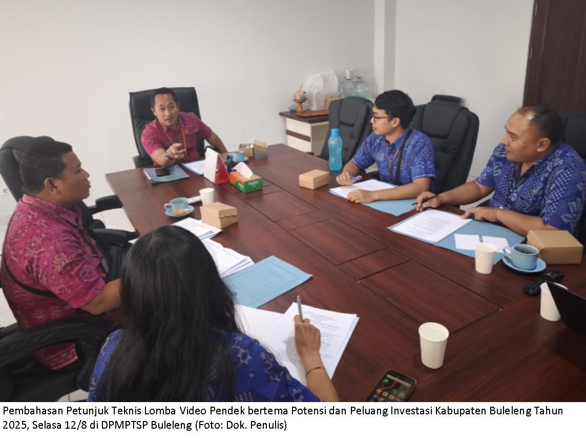 Dinas Penanaman Modal dan Pelayanan Terpadu Satu Pintu (DPMPTSP) Kabupaten Buleleng bersama tim juri yang terdiri dari perwakilan Brida Kabupaten Buleleng, Diskominfosanti Kabupaten Buleleng, serta Kardian Narayana, mengikuti rapat pembahasan Petunjuk Teknis (Juknis) Lomba Video Pendek bertema Potensi dan Peluang Investasi Kabupaten Buleleng Tahun 2025.