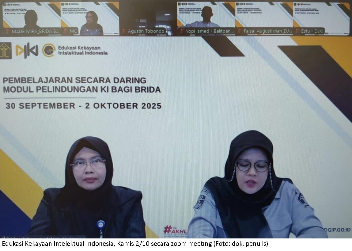 Direktorat Jenderal Kekayaan Intelektual (DJKI) Kementerian Hukum RI menyelenggarakan kegiatan ”Edukasi Kekayaan Intelektual Indonesia” dengan metode pembelajaran daring menggunakan modul ”Pelindungan KI Tingkat Menengah”, selama 3 hari dari tanggal 30 September hingga 2 Oktober 2025, dengan peserta dari Brida provinsi, kabupaten dan kota.