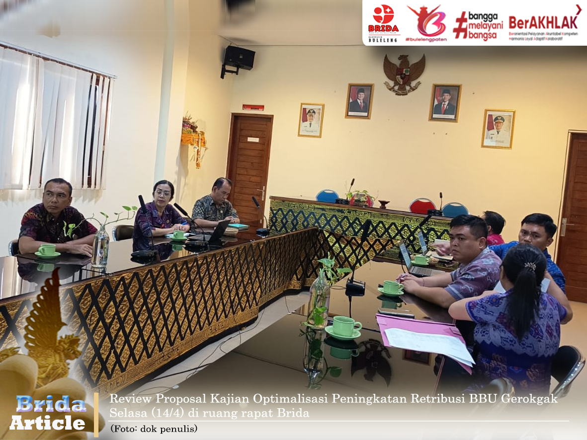 Badan Riset dan Inovasi Daerah (BRIDA) Kabupaten Buleleng melaksanakan review Proposal Kajian Optimalisasi Peningkatan Retribusi Balai Benih Unggul (BBU) Gerokgak di Kabupaten Buleleng, Selasa (14/4) di ruang rapat setempat. Review dipimpin Sekretaris BRIDA sekaligus Ketua tim Persiapan, drg. I Ketut Wika bersama anggota tim persiapan.