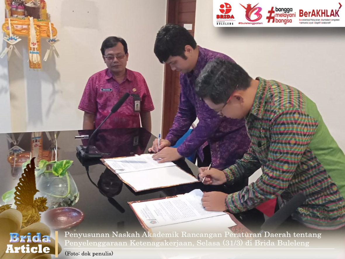 Badan Riset dan Inovasi Daerah (Brida) Kabupaten Buleleng melaksanakan penandatanganan kontrak kerja dengan Tim Pelaksana Universitas Pendidikan Ganesha (Undiksha) Singaraja, Selasa (31/3) di ruang rapat setempat, dalam rangka Penyusunan Naskah Akademik Rancangan Peraturan Daerah Kabupaten Buleleng tentang Penyelenggaraan Ketenagakerjaan.