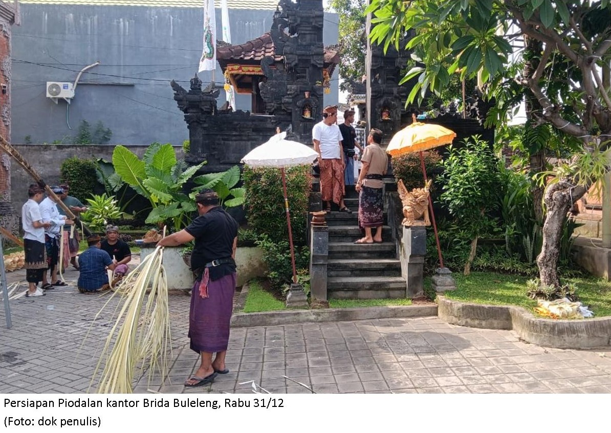 Upacara Piodalan kantor Badan Riset dan Inovasi Daerah (Brida) Kabupaten Buleleng yang dilaksanakan setiap setahun sekali, tepatnya pada Purnama Sasih Kapitu kini kembali dipersiapkan. Menjelang puncak Piodalan pada 3 Januari 2026 mendatang, hari ini para pegawai Brida sudah mulai mempersiapkannya dengan berbagai kegiatan. Mulai dari Upacara Macaru di pekarangan kantor, piuning dan nunas tirhta di Pura Kahyangan Tiga, Pura Padma Bhuwana, dan Pura Jagat Natha Buleleng.
