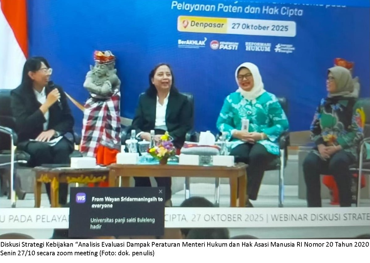 BRIDA, Kementerian Hukum (Kemenkum) Kanwil Bali menyelenggarakan Diskusi Strategi Kebijakan dengan topik “Analisis Evaluasi Dampak Peraturan Menteri Hukum dan Hak Asasi Manusia RI Nomor 20 Tahun 2020 tentang Syarat dan Tata Cara Pengenaan Tarif Tertentu Terhadap Pelayanan Paten dan Hak Cipta”, Senin (27/10) secara zoom meeting.