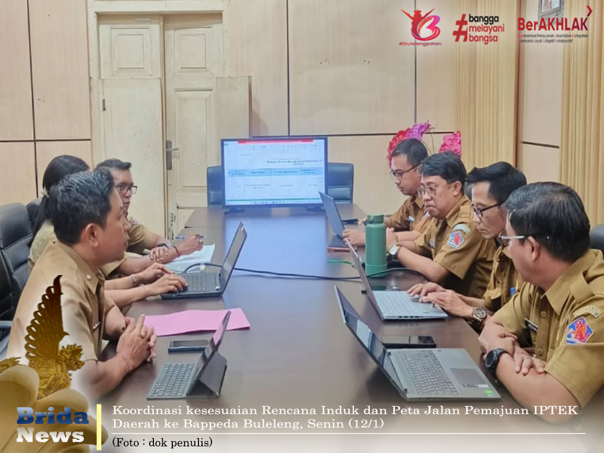 Buleleng - Badan Riset dan Inovasi Daerah (Brida) Kabupaten Buleleng melaksanakan koordinasi terkait kesesuaian Pot Rencana Induk dan Peta Jalan Pemajuan Ilmu Pengetahuan dan Teknologi (IPTEK) Daerah Kabupaten Buleleng dengan RPJMD 2025–2029, bersama Badan Perencanaan Pembangunan Daerah (Bappeda) Kabupaten Buleleng, pada Senin, 12 Januari 2026.