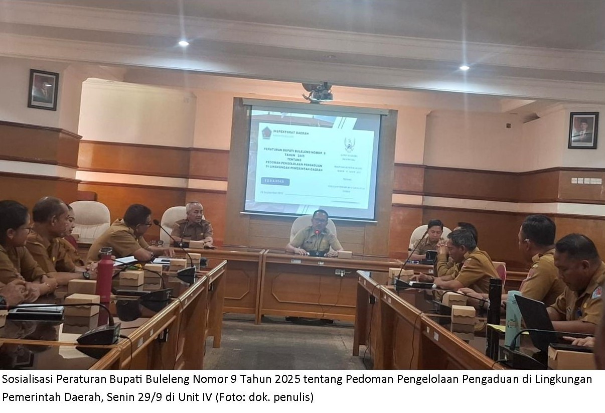 BRIDA, Pemerintah Kabupaten Buleleng melalui Inspektorat Daerah menyelenggarakan sosialisasi Peraturan Bupati Buleleng Nomor 9 Tahun 2025 tentang Pedoman Pengelolaan Pengaduan di Lingkungan Pemerintah Daerah, pada Senin (29/9) di Unit IV Sekretariat Daerah Kabupaten Buleleng.