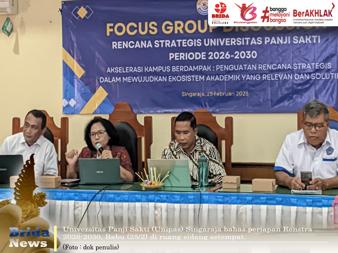 Buleleng - Badan Riset dan Inovasi Daerah (Brida) Kabupaten Buleleng menghadiri Focus Group Discussion (FGD) Rencana Strategis (Renstra) Universitas Panji Sakti (Unipas) Singaraja, LPM, dan LP2M periode 2026–2030, Rabu (25/2) di ruang sidang setempat.