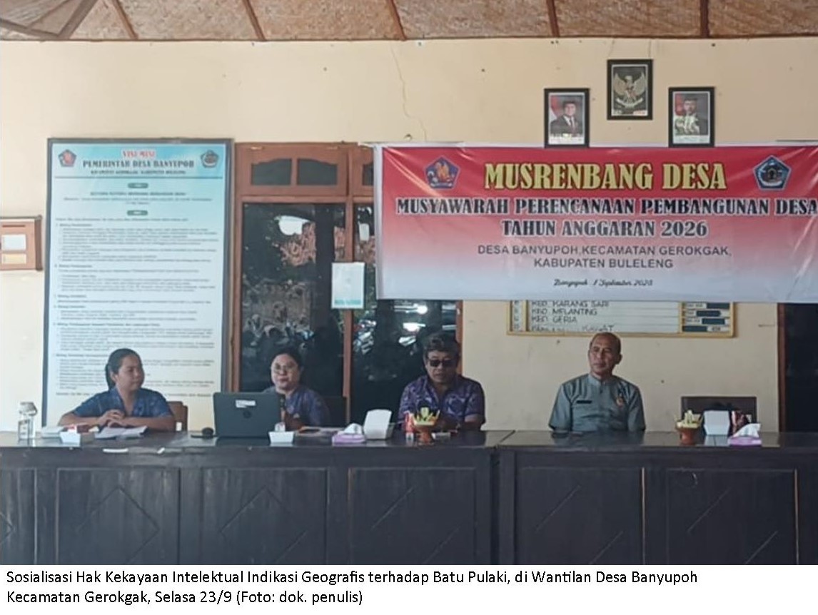 BRIDA, Badan Riset dan Inovasi Daerah (Brida) Kabupaten Buleleng melaksanakan sosialisasi Hak Kekayaan Intelektual Indikasi Geografis terhadap Batu Pulaki di Wantilan Desa Banyupoh Kecamatan Gerokgak Kabupaten Buleleng, Selasa (23/9).