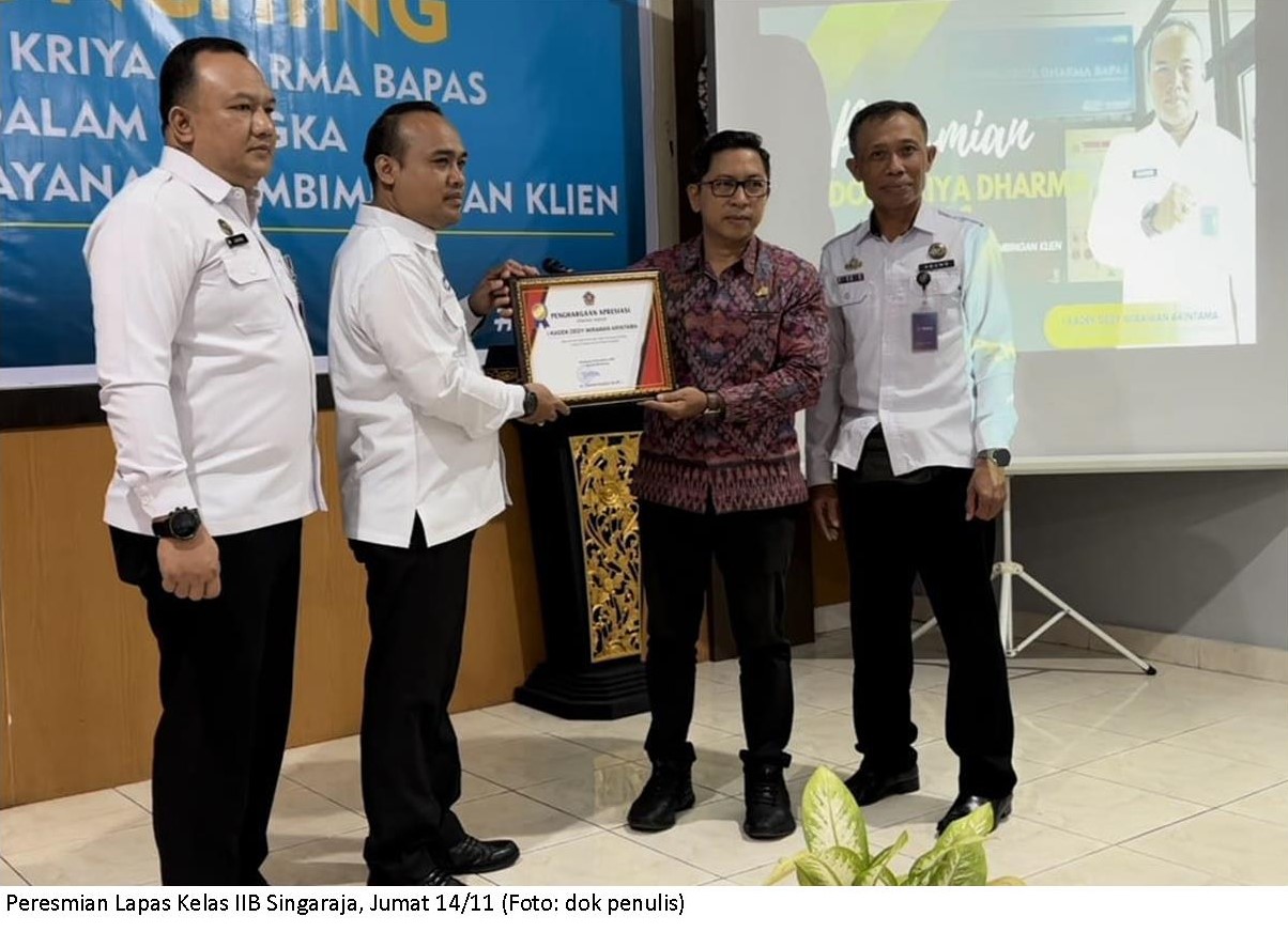 BRIDA - Balai Pemasyarakatan (Bapas) Kelas I Denpasar meresmikan Pondok Kriya Dharma, sebuah inovasi layanan untuk optimalisasi pembimbingan, pengawasan, dan pendampingan klien pemasyarakatan di wilayah Singaraja. Peresmian yang berlangsung di Lapas Kelas IIB Singaraja ini, Jumat (14/11) dihadiri Kepala Bapas Kelas I Denpasar beserta jajaran Pembimbing Kemasyarakatan (PK).