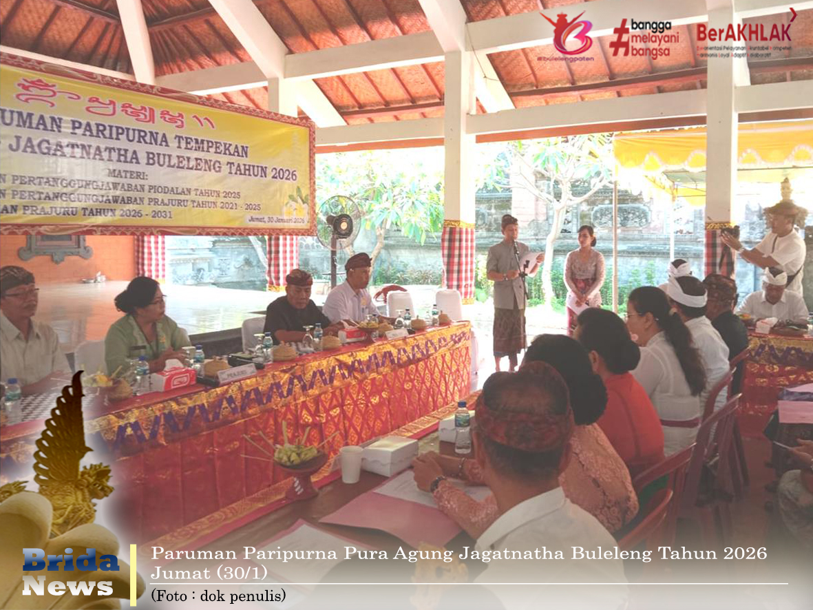 Buleleng - Badan Riset dan Inovasi Daerah (Brida) Kabupaten Buleleng yang diwakili Oleh I Gede Suardika dan I Putu Mariasa, menghadiri Paruman Paripurna Pura Agung Jagatnatha Buleleng di wantilan pura setempat.