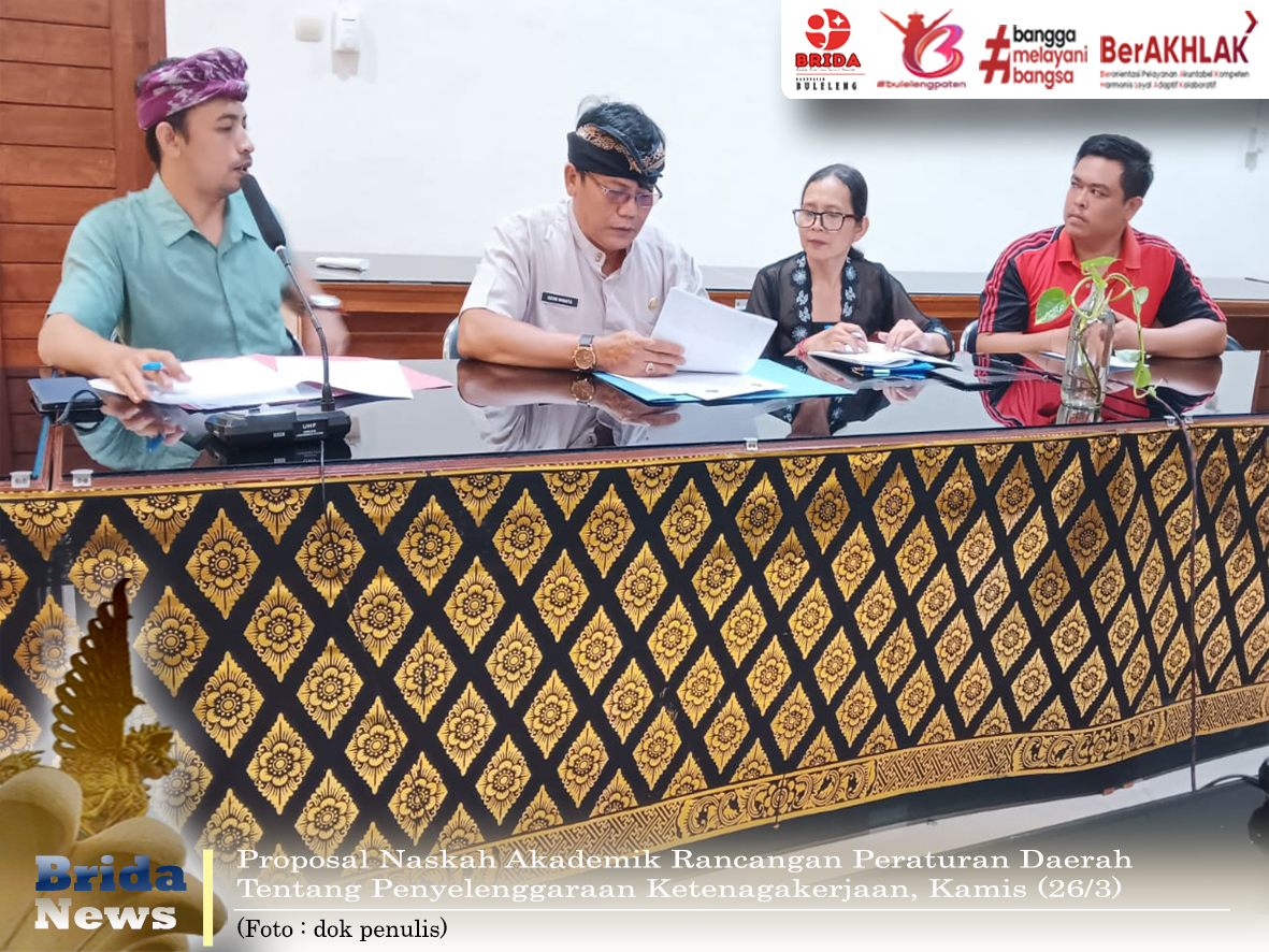Buleleng - Tim Persiapan Badan Riset dan Inovasi Daerah (Brida) Kabupaten Buleleng telah mereview Proposal Penyusunan Naskah Akademik Rancangan Peraturan Daerah Kabupaten Buleleng Tentang Penyelenggaraan Ketenagakerjaan, Kamis (26/3) di kantor setempat.
