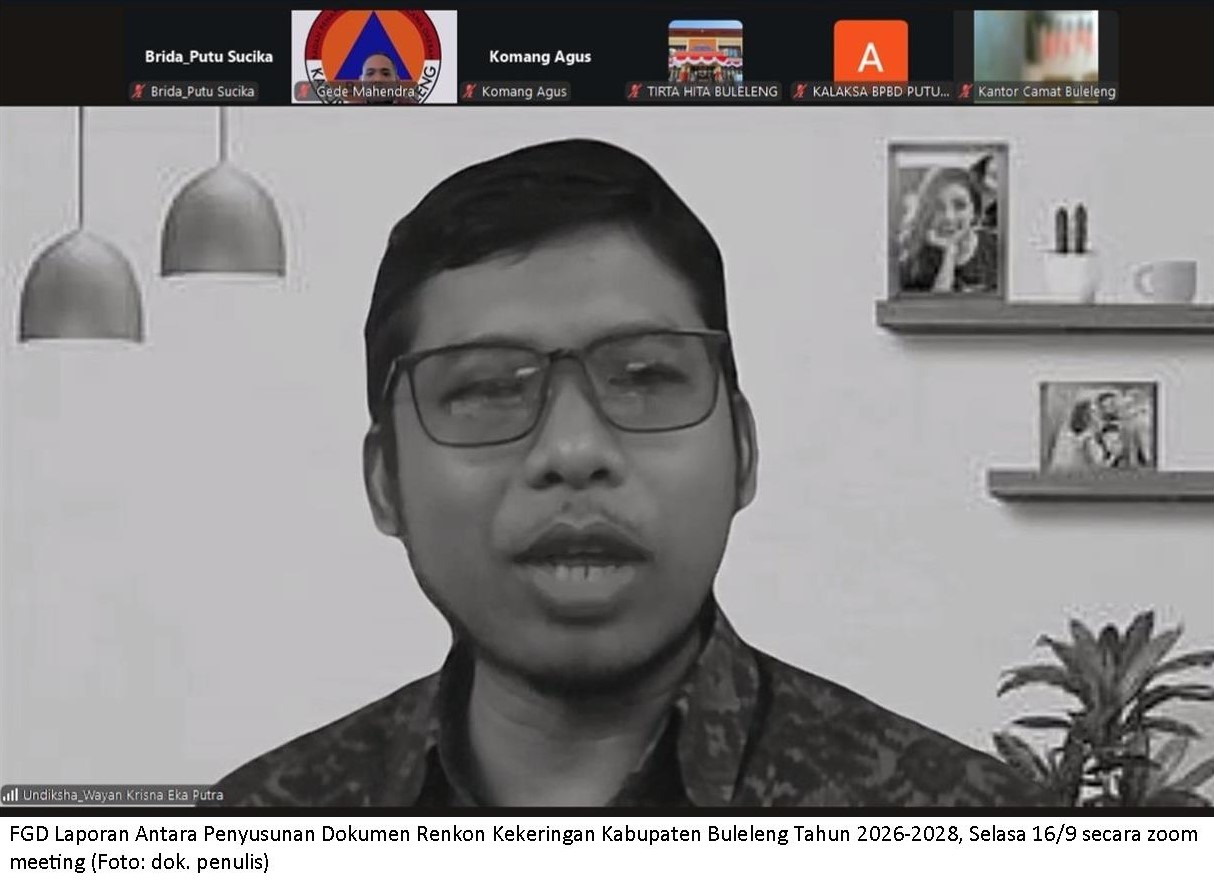 BRIDA, Badan Riset dan Inovasi Daerah (Brida) Kabupaten Buleleng diwakili oleh Penelaah Teknis Kebijakan Brida Putu Sucika, S.Sos., mengikuti Focus Group Discussion (FGD) Laporan Antara Penyusunan Dokumen Rencana Kontinjensi (Renkon) Kekeringan Kabupaten Buleleng Tahun 2026-2028, yang digelar secara daring melalui Zoom Meeting oleh Badan Penanggulangan Bencana Daerah (BPBD) Kabupaten Buleleng, Selasa (16/9).