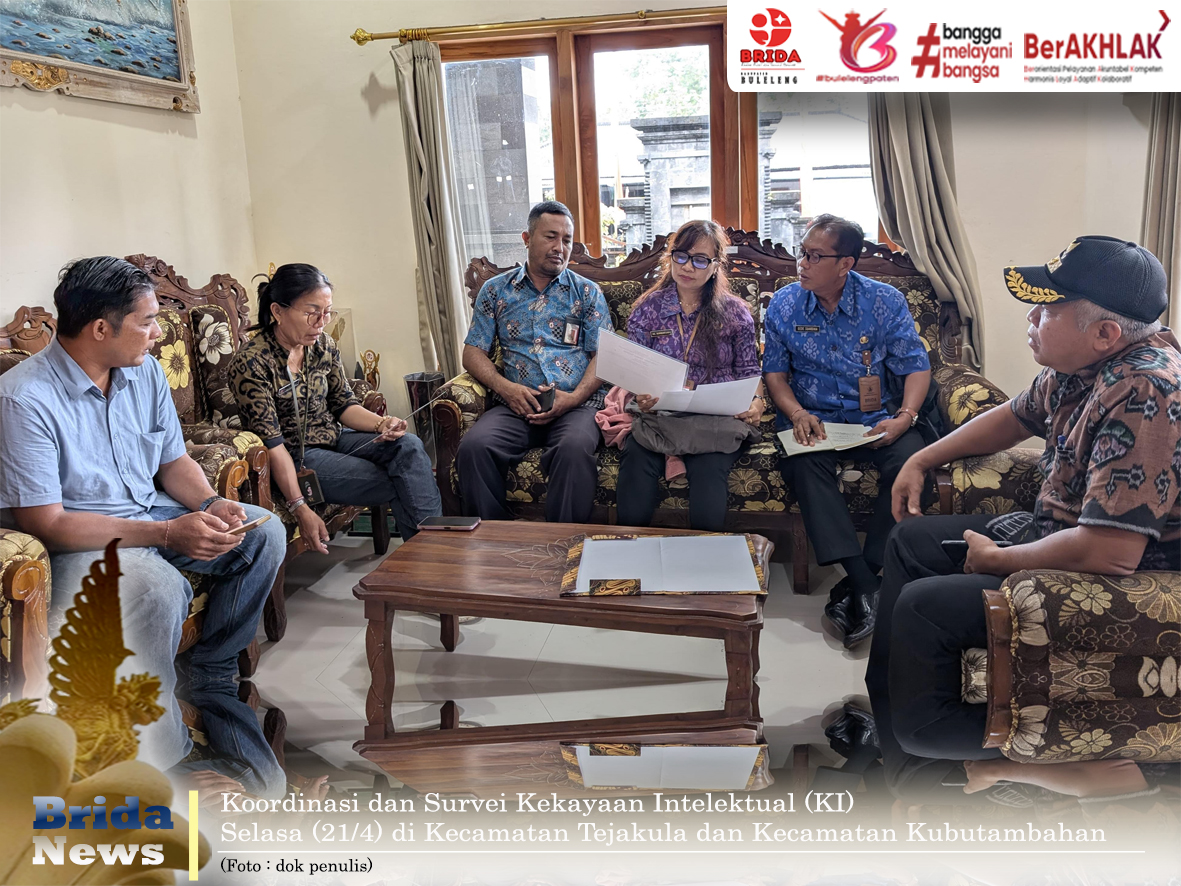 Buleleng - Pemerintah Kabupaten Buleleng melalui Badan Riset dan Inovasi Daerah (Brida) melaksanakan koordinasi dan survei Kekayaan Intelektual (KI), Selasa (21/4) di Kecamatan Tejakula dan Kecamatan Kubutambahan. Tim KI Brida diikuti juga oleh perwakilan Dinas Pertanian dan Ketahanan Pangab serta Dinas Perdagangan, Perindustrian, Koperasi dan UKM sebagai upaya fasilitasi, perlindungan, dan pengembangan KI daerah.