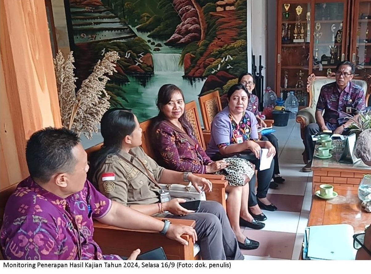 BRIDA, Tim Monitoring dan Evaluasi Brida Buleleng melaksanakan monev hasil kajian 2024 pada perangkat daerah pengampu kajian, Selasa (16/9), dalam rangka menindaklanjuti penerapan hasil kajian/riset yang telah disampaikan pada akhir tahun 2024, dan juga untuk memberikan informasi sesuai rekomendasi hasil kajian.