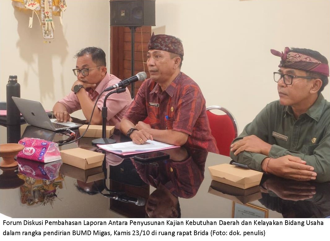 BRIDA, Badan Riset dan Inovasi Daerah (Brida) Kabupaten Buleleng menyelenggarakan Forum Diskusi Pembahasan Laporan Antara Penyusunan Kajian Kebutuhan Daerah dan Kelayakan Bidang Usaha dalam rangka Pendirian Badan Usaha Milik Daerah (BUMD) Migas, Kamis (23/10) di ruang rapat setempat.