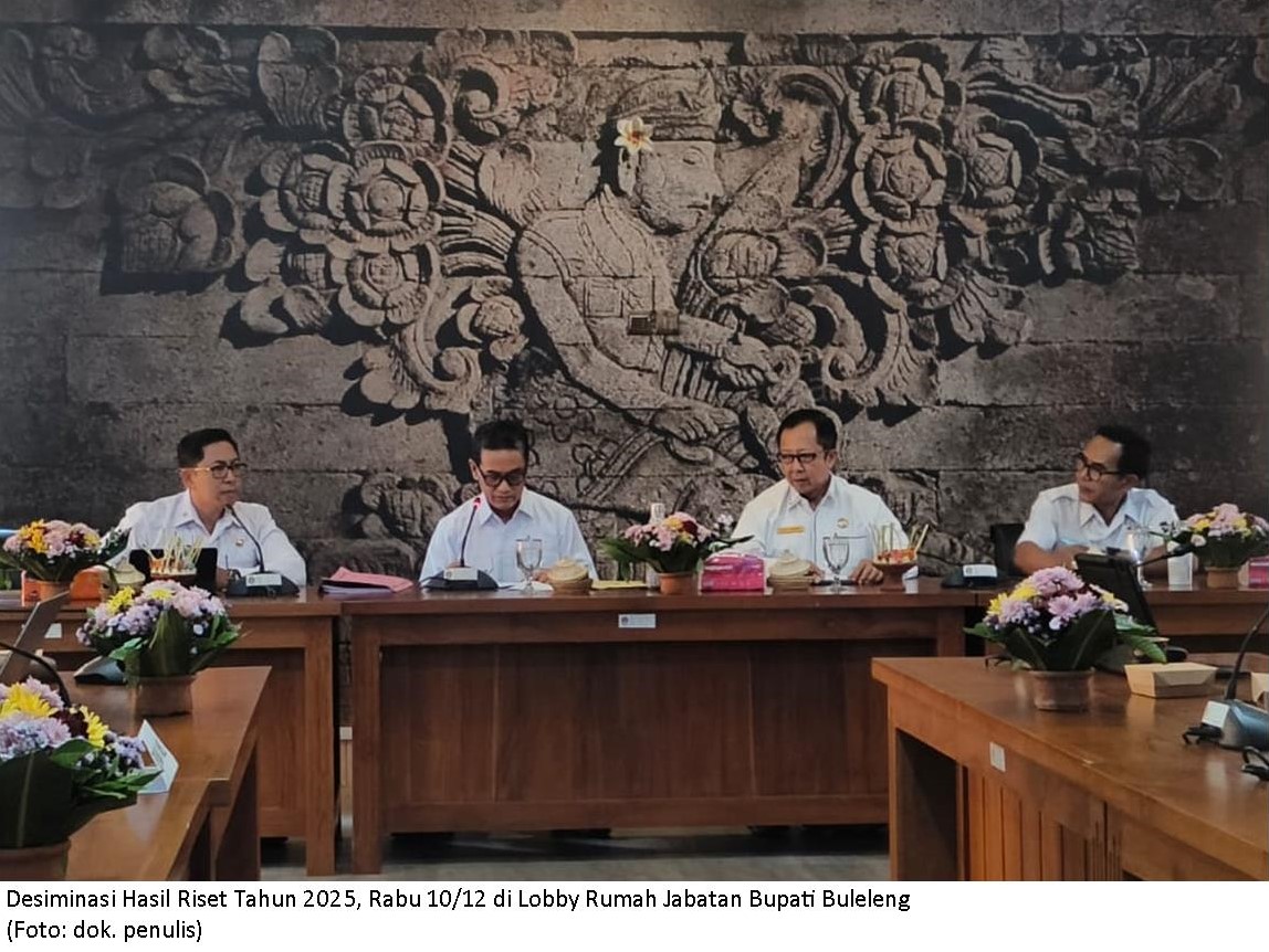 Brida News - Badan Riset dan Inovasi Daerah (Brida) Kabupaten Buleleng menyelenggarakan kegiatan Desiminasi Hasil Riset Tahun 2025, Rabu (10/12) bertempat di Lobby Rumah Jabatan Bupati Buleleng. Kegiatan ini merupakan wadah untuk menyampaikan hasil-hasil riset yang telah dilaksanakan sepanjang tahun 2025 kepada perangkat daerah, dan para pemangku kepentingan agar dapat dimanfaatkan dalam penyusunan kebijakan dan program pembangunan daerah.